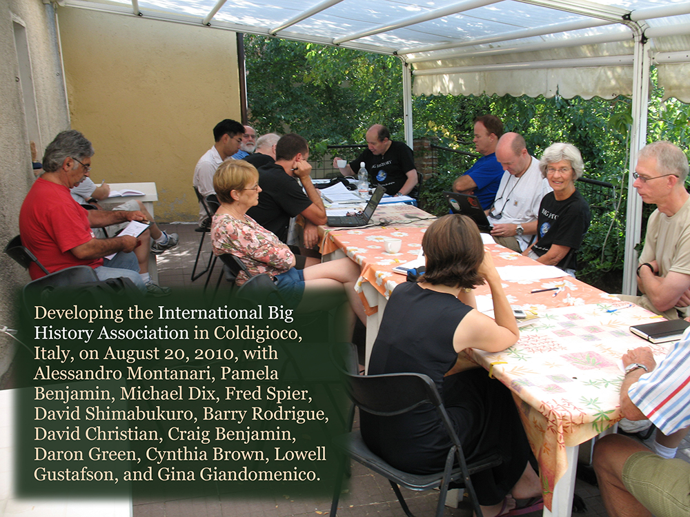 The Big Historians who met at Coldigioco were David Christian of Macquarie University in Sydney (Australia), Fred Spier of the University of Amsterdam (Netherlands), Walter Alvarez of the University of California at Berkeley (USA), Craig Benjamin of Grand Valley State University in Michigan (USA), Cynthia Brown of Dominican University in California (USA), Lowell Gustafson of Villanova University in Pennsylvania (USA), and Barry Rodrigue of the University of Southern Maine (USA). We constituted ourselves as a provisional executive committee and voted in favor of the following initiatives:
